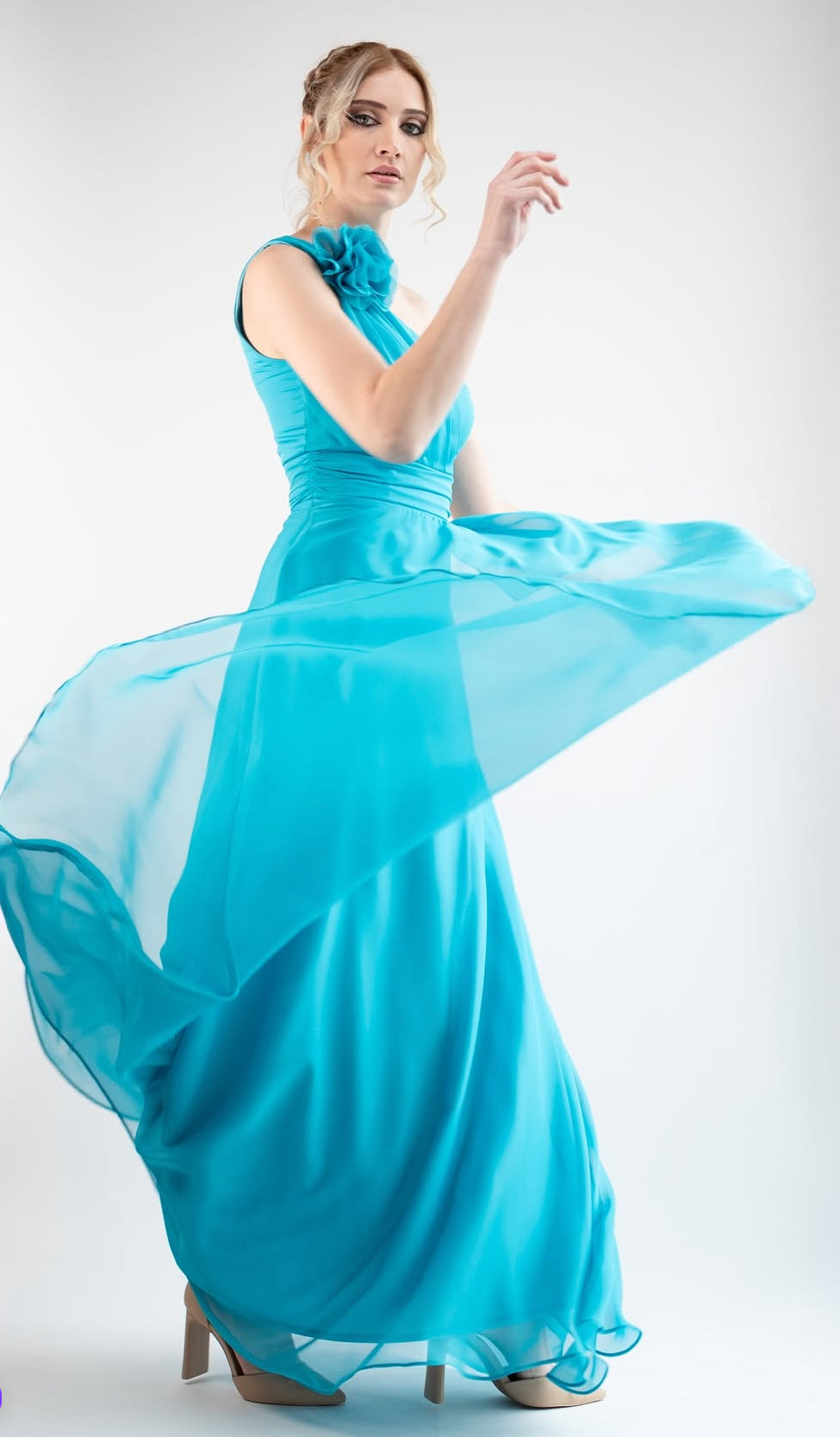 Deslumbra en cualquier ocasión especial con este elegante vestido largo confeccionado en gasa fluida que aporta movimiento y ligereza. Su diseño de un solo hombro realza la silueta con un aire sofisticado y moderno, acompañado de un detalle floral drapeado en el tirante que aporta un toque romántico y femenino.