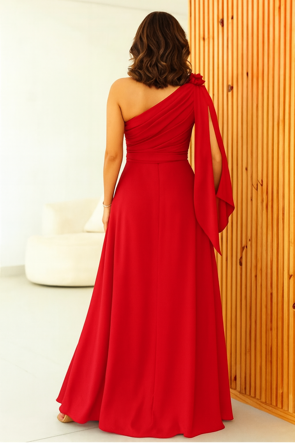 Este vestido largo en tono sandía es ideal para lucir sofisticada y femenina en cualquier evento especial. Su diseño de un solo hombro con detalle floral y manga capa aporta un toque moderno y distinguido, mientras que la abertura lateral en la falda realza la silueta de manera sutil y elegante. Perfecto para matrimonios, galas o celebraciones donde quieras brillar con seguridad y glamour. 🌹👠