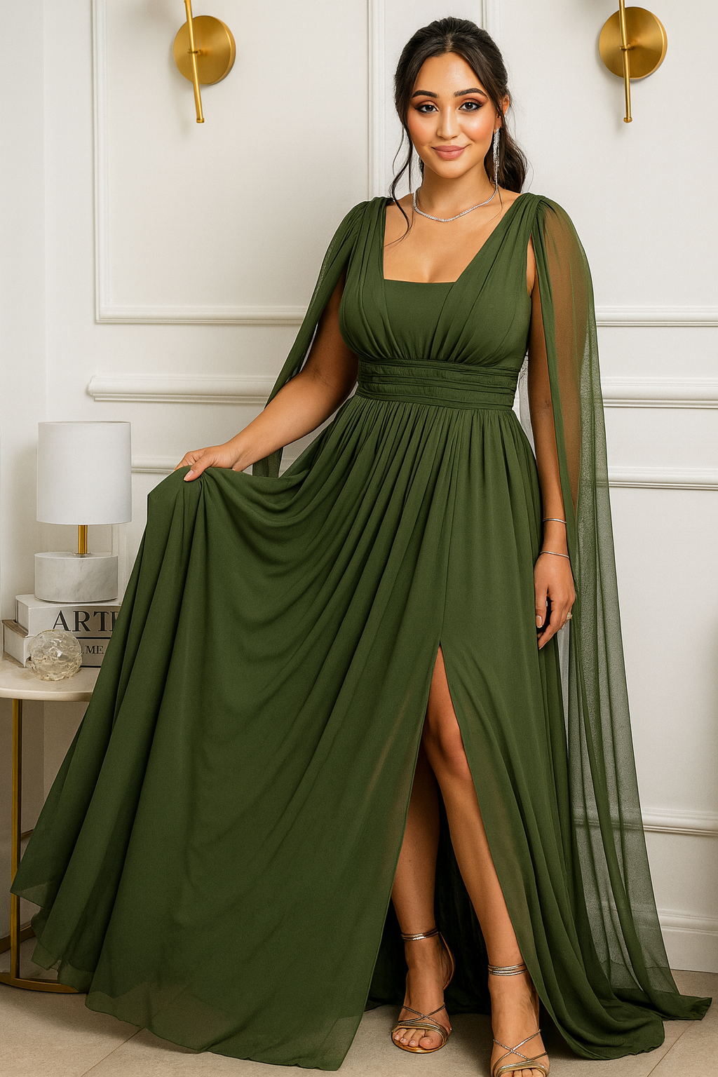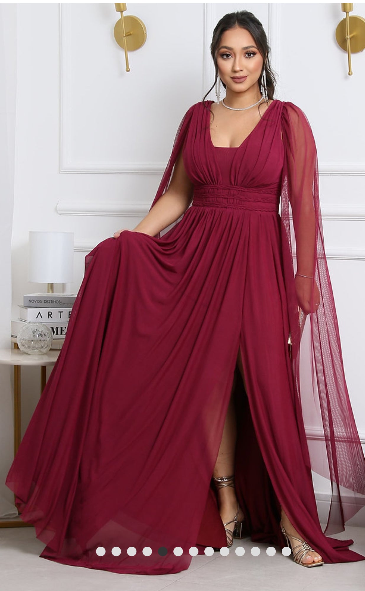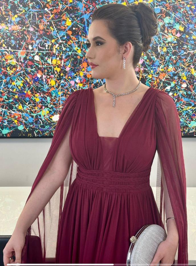 Este vestido de fiesta Ferny destaca por sus elegantes alas que aportan un toque único y sofisticado. Con una delicada aplicación en la cintura que realza la figura, y un favorecedor escote en V confeccionado en tela gasa, ofrece ligereza y movimiento para una presencia inolvidable en cualquier evento especial.