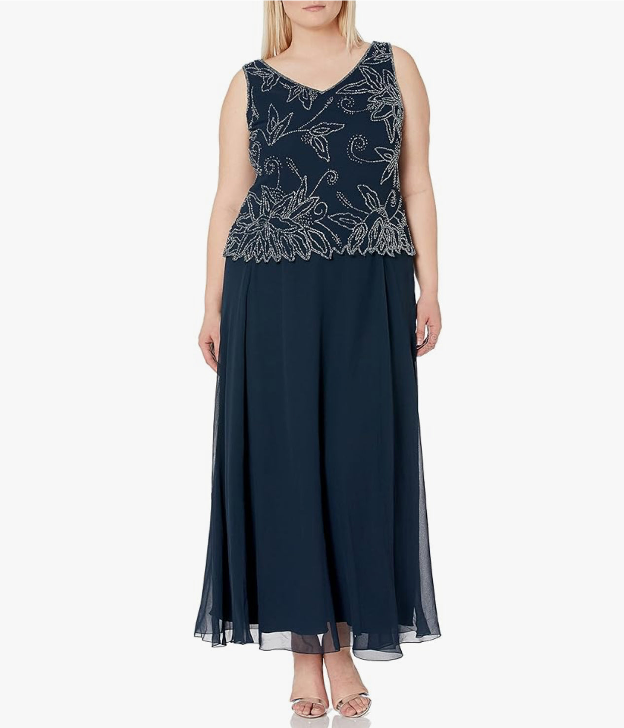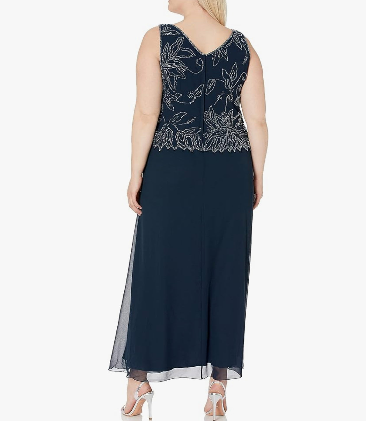 Este elegante vestido azul marino es ideal para madrinas o invitadas que buscan comodidad sin perder sofisticación. De corte largo y fluido, está confeccionado en gasa liviana que aporta movimiento y frescura. El conjunto incluye una capa tipo chaqueta con mangas tres cuartos y transparencias, adornada con delicados bordados en pedrería de diseño floral que enmarcan el cuello y el ruedo, brindando un toque refinado. Su diseño suelto y favorecedor lo convierte en una opción perfecta para eventos formales, celebraciones nocturnas o matrimonios, ofreciendo elegancia atemporal con gran comodidad.