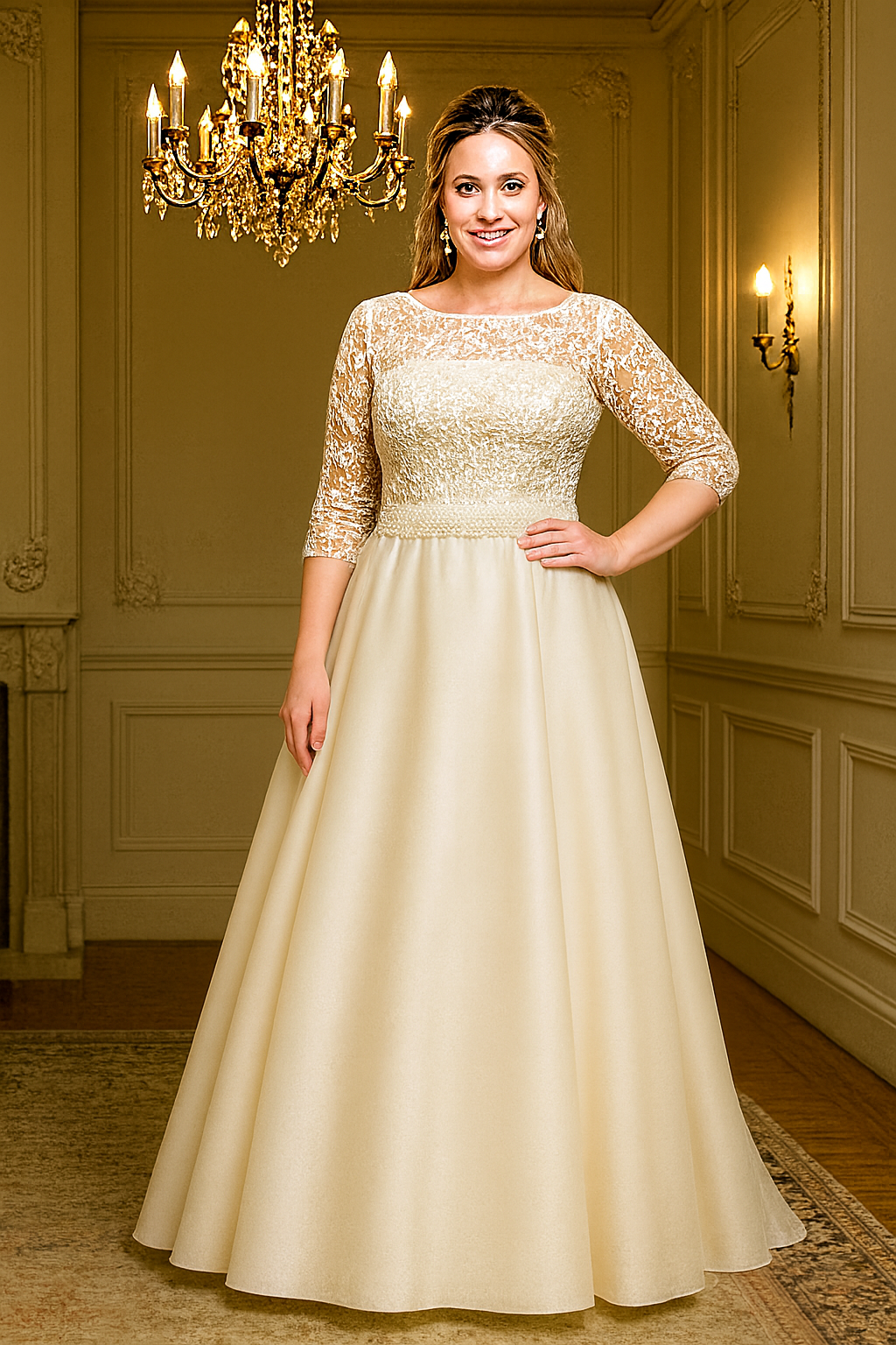 Vestido de novia elegante y romántico confeccionado en un diseño A-line que estiliza la figura con naturalidad. El corpiño está elaborado en encaje de algodón delicado con mangas tres cuartos semitransparentes, aportando un aire sofisticado y refinado. Su escote redondeado realza la feminidad de manera sutil y favorecedora.