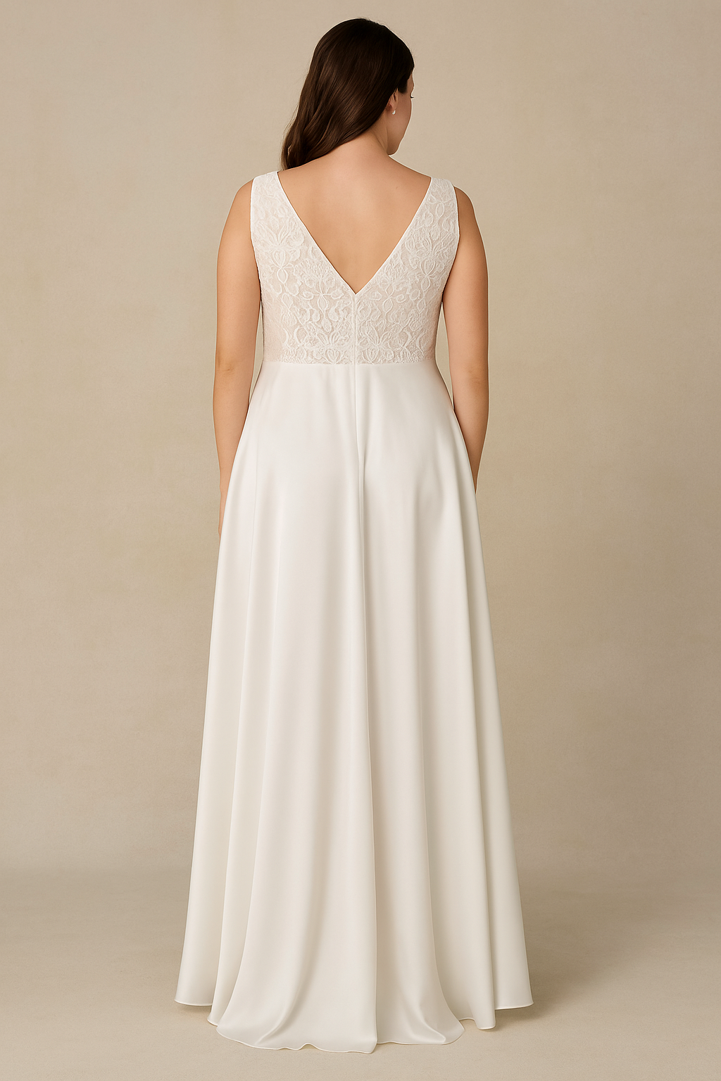 Vestido de novia romántico y delicado, diseñado para resaltar la feminidad con un estilo fresco y elegante. Presenta un escote en V con tirantes anchos que estilizan los hombros y aportan un toque moderno y favorecedor. El corpiño está elaborado en encaje floral de algodón con transparencias sutiles, que añade textura y sofisticación al diseño.