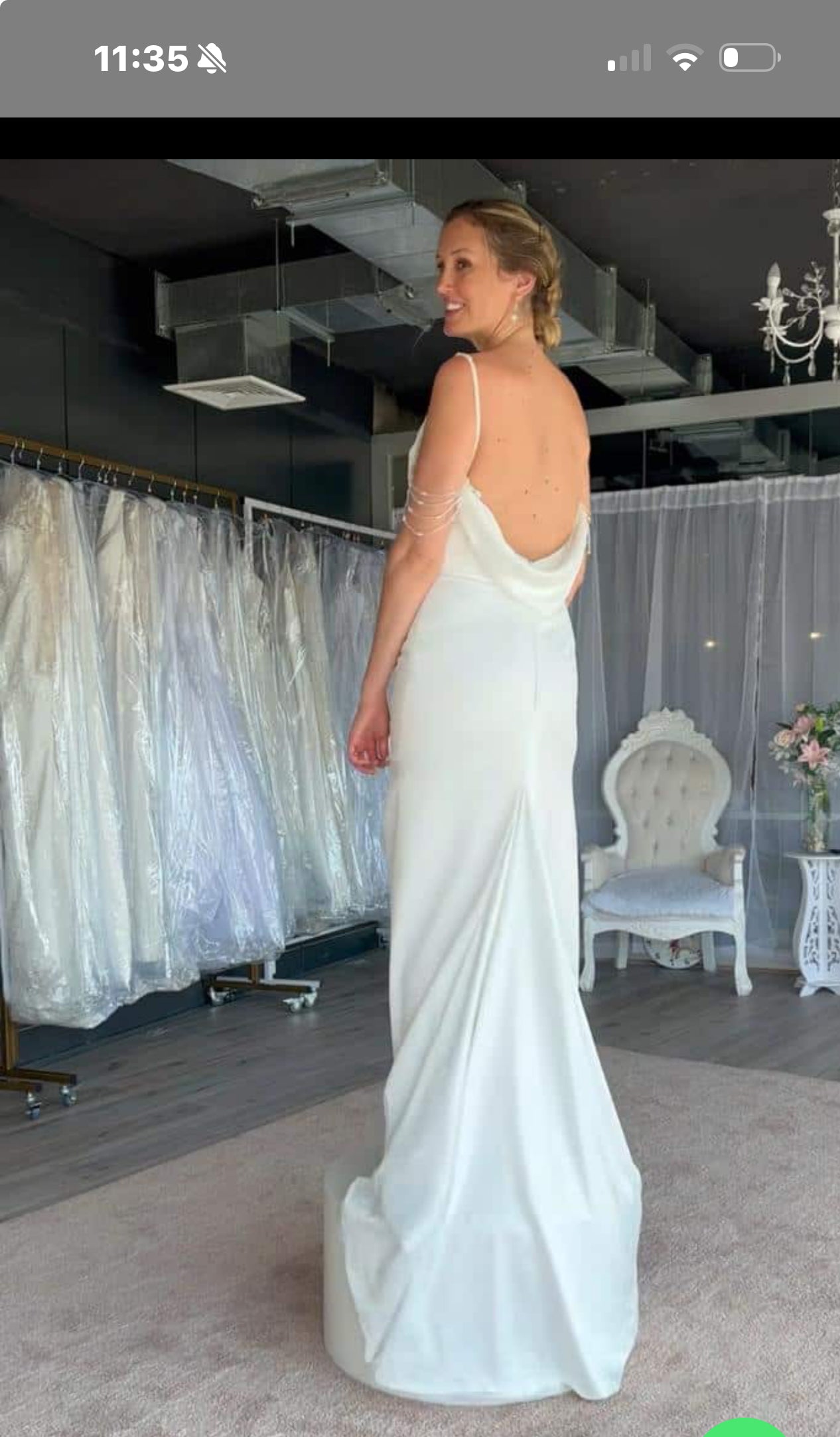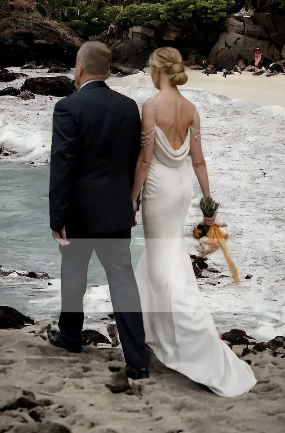 - Espalda: La parte posterior del vestido es baja y abierta, complementada con un diseño en cascada que aporta movimiento y fluidez, ideal para una celebración al aire libre.