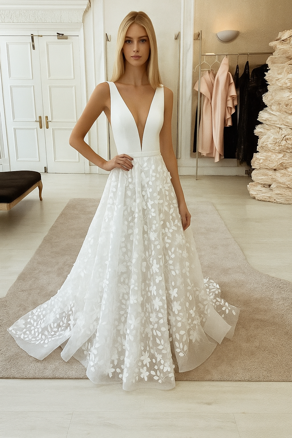 Vestido de novia Karla: diseño boho con flores en 3D que capturan la esencia romántica de tu día especial. Presenta un generoso escote frontal y posterior que realza la elegancia natural, permitiendo movimiento fluido y comodidad durante la ceremonia. Las flores tridimensionales añaden textura y profundidad, creando un efecto visual cautivador. Ideal para novias que buscan un estilo bohemio sofisticado con detalles artesanales que destacan sin perder la gracia clásica del vestido de novia.