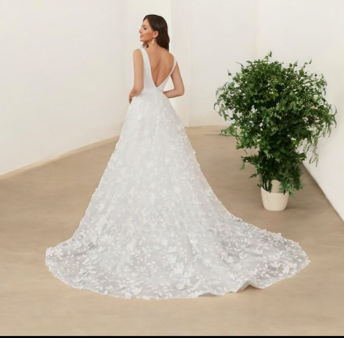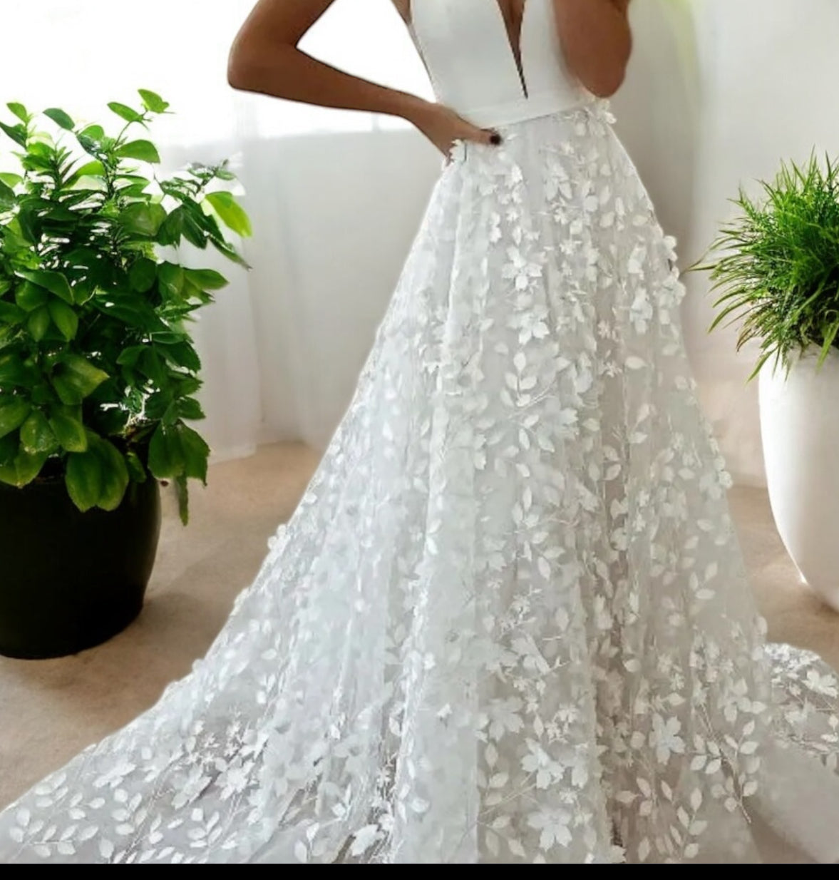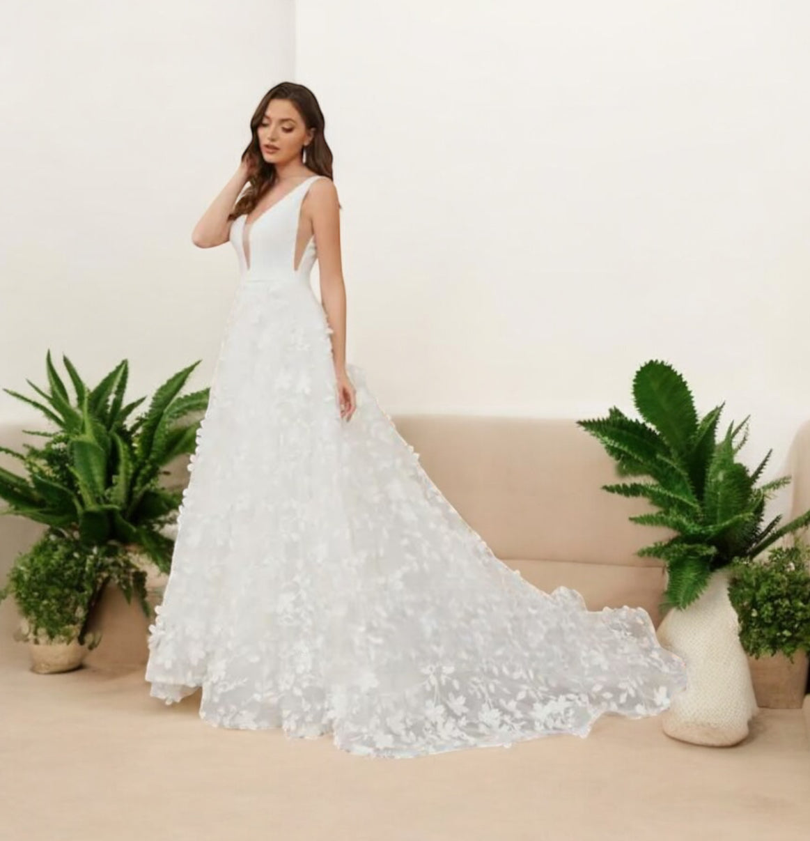 Vestido de novia Karla con flores en 3D estilo boho , gran escote frontal y en la espalda