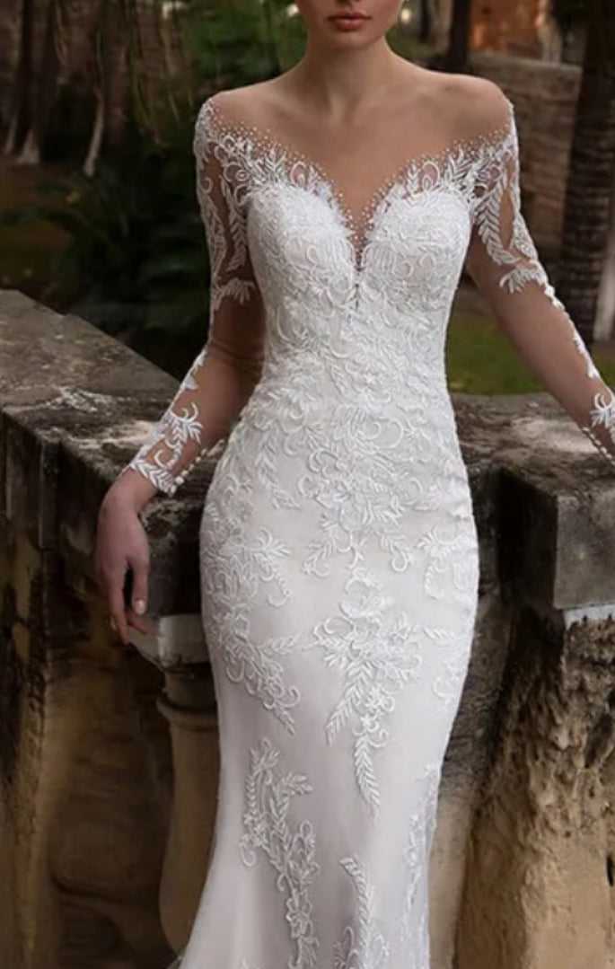 Este impresionante vestido de novia es la elección perfecta para la novia que busca una apariencia elegante y atemporal. Confeccionado en delicado encaje blanco, el vestido presenta un diseño de manga larga que añade un toque de sofisticación. Su escote en V profundo resalta la figura, mientras que el ajuste ceñido en el torso aporta una silueta favorecedora.