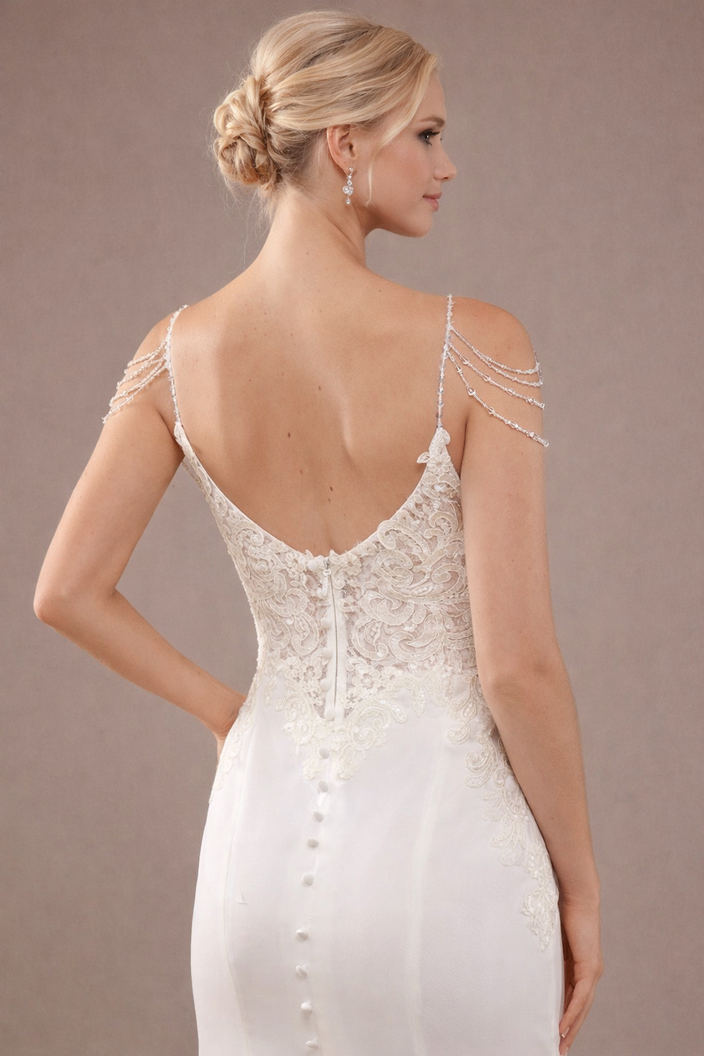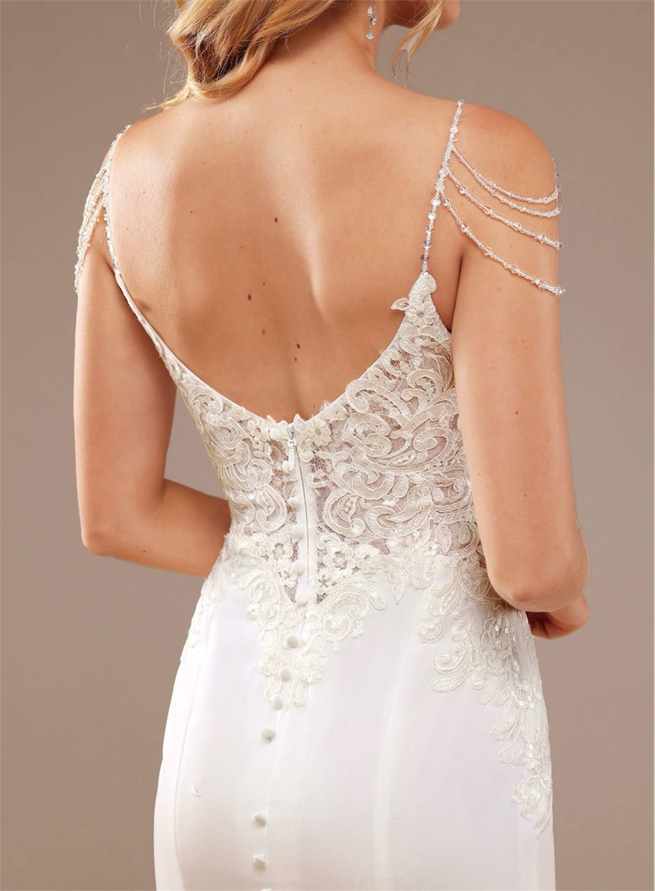 • Espalda escotada con terminaciones delicadas