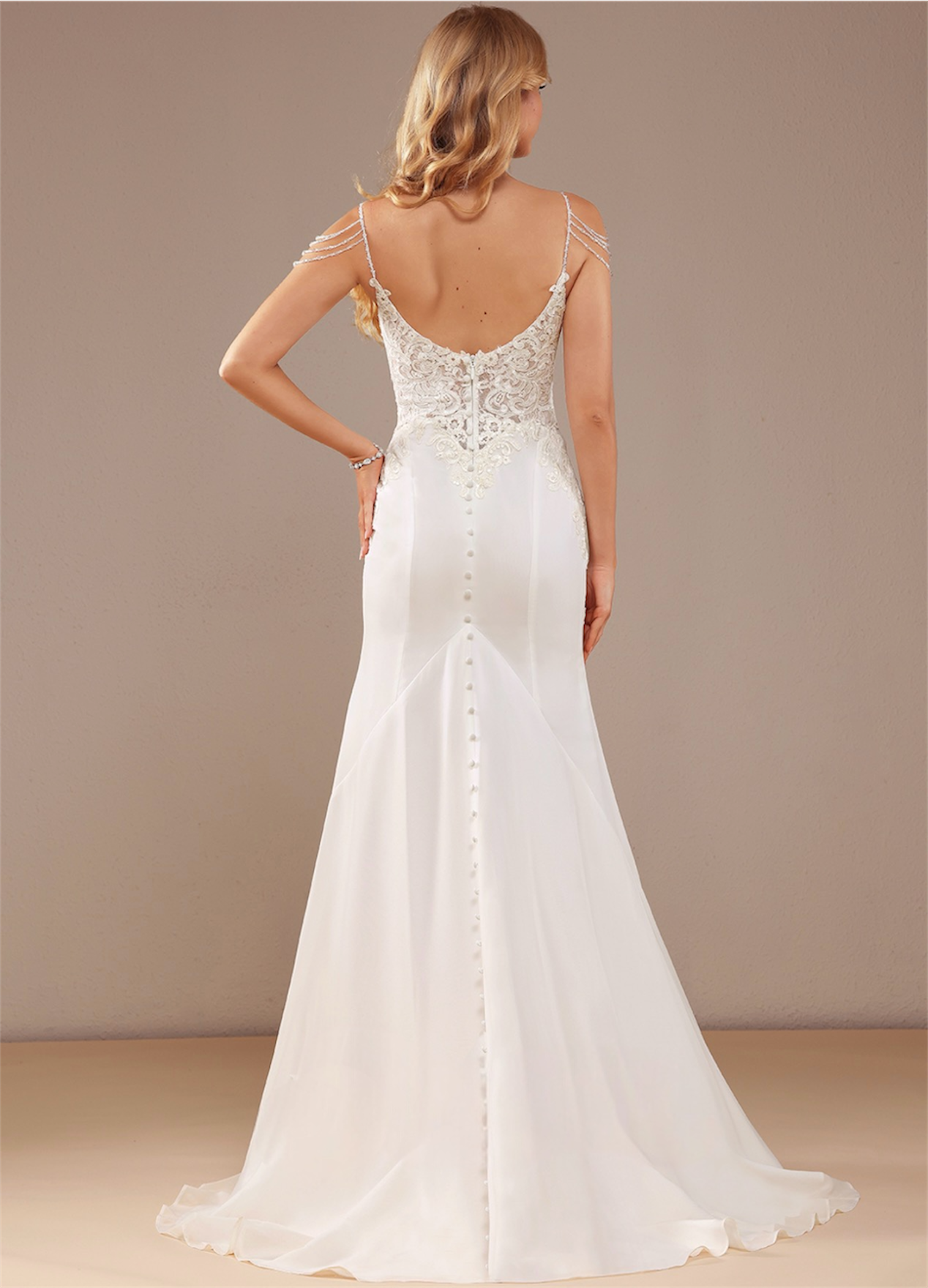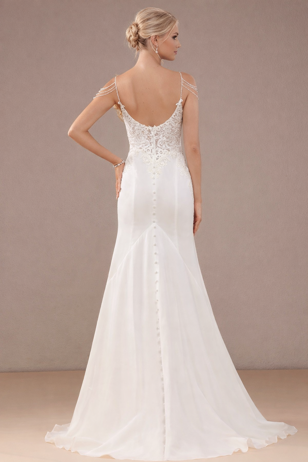 Vestido de novia Rose estilo sirena ,aplicaciones en tirantes y botones en la cola