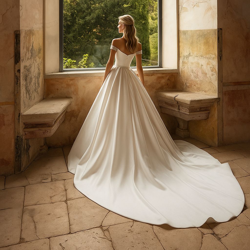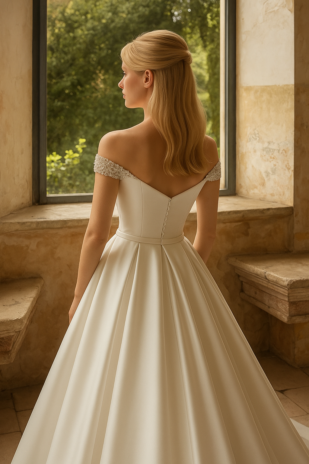 Este vestido de novia estilo princesa es una propuesta clásica y sofisticada. Confeccionado en satén de alta calidad, destaca por su escote en V con hombros caídos, enmarcado por un delicado borde de pedrería que añade brillo y elegancia sin recargar. El cuerpo estructurado realza la figura, mientras que la amplia falda de gran caída aporta volumen y movimiento, ideal para ceremonias tradicionales. Su diseño atemporal y femenino lo convierte en una opción perfecta para novias que buscan un look romántico, refinado y de alto impacto visual.