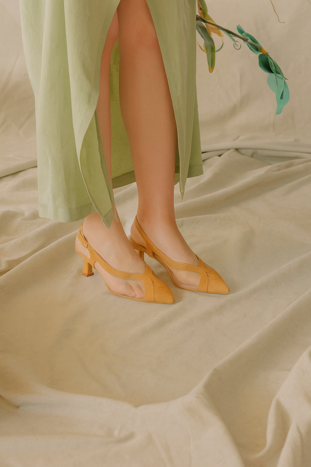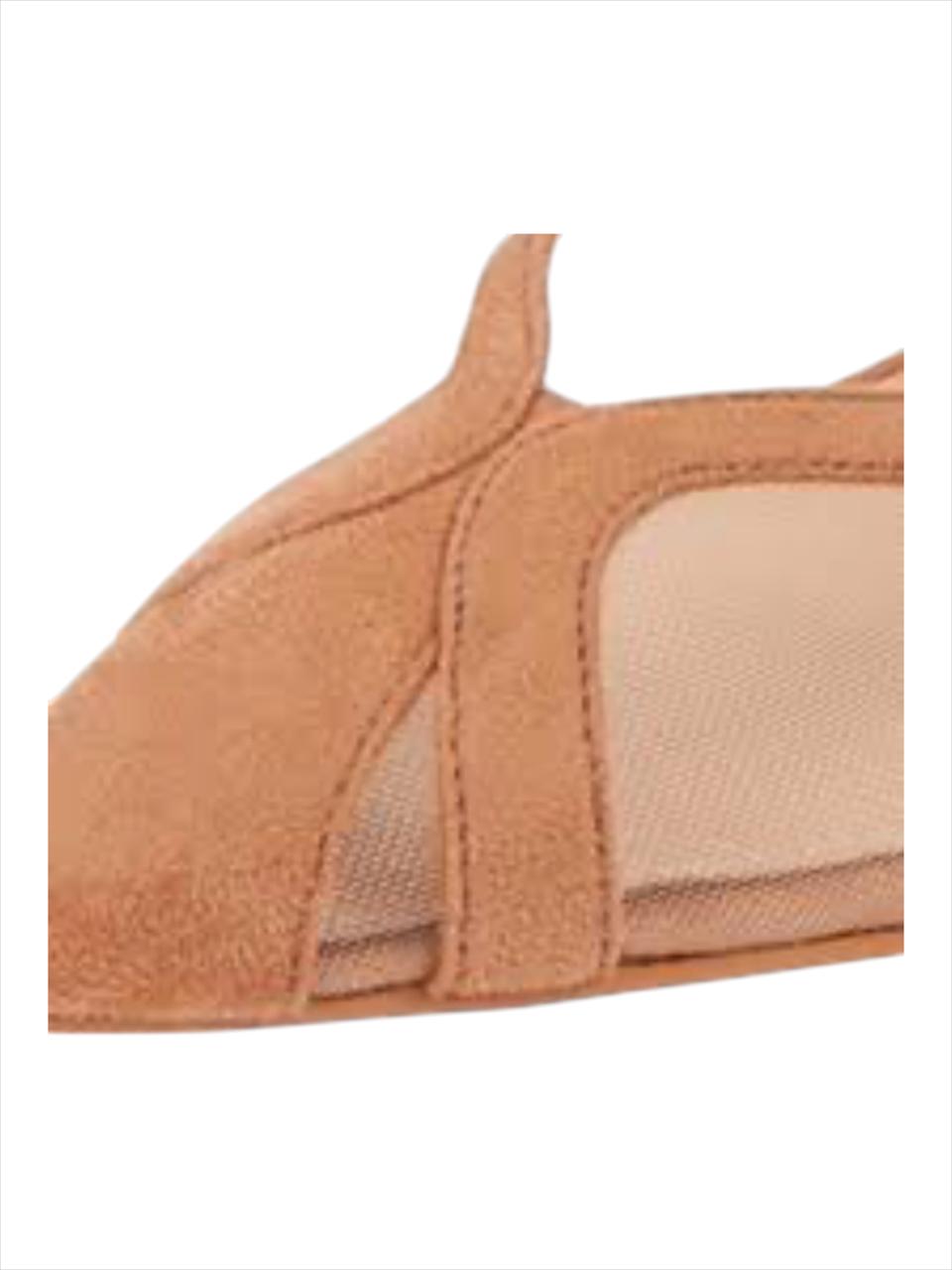 Zapato slingback en tono camel, diseñado para combinar elegancia y comodidad en cualquier ocasión. Presenta una silueta estilizada con punta fina, detalles en gamuza y laterales en malla translúcida que aportan un toque moderno y sofisticado. Su taco bajo geométrico ofrece estabilidad y confort, ideal para usarlos durante largas jornadas o eventos especiales. Cierre ajustable con hebilla metálica para un calce seguro.