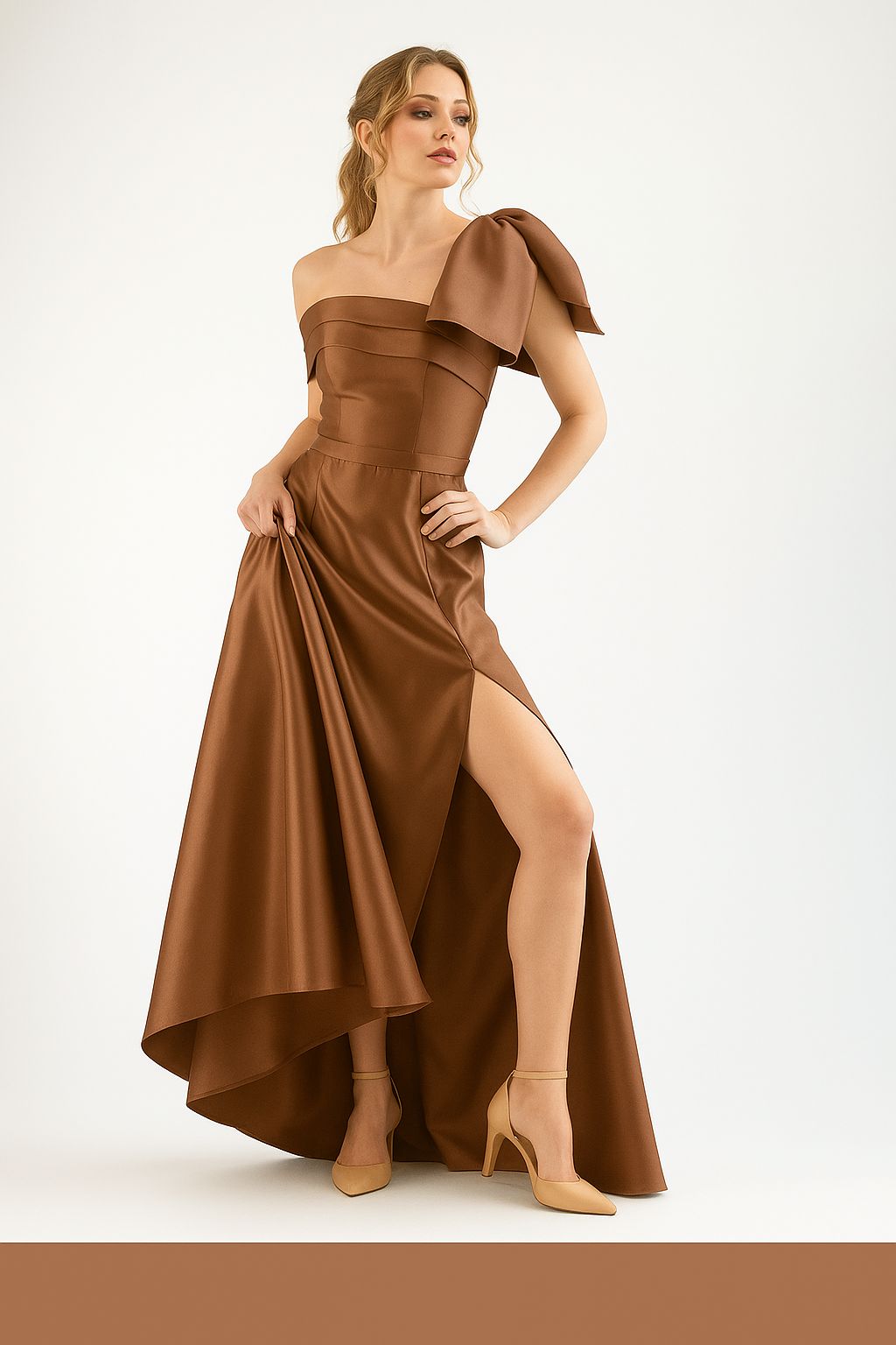 VESTIDO DE FIESTA ANAHY CON APLICACION NUDO Y HOMBRO DESCUBIERTO
