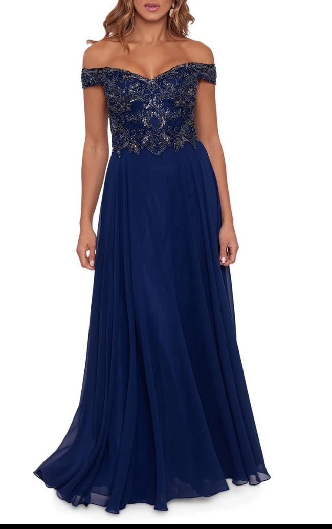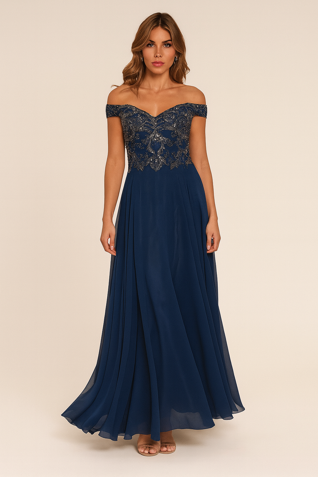 💙 Vestido de Fiesta Largo Azul Marino con Bordado y Hombros Descubiertos 💙