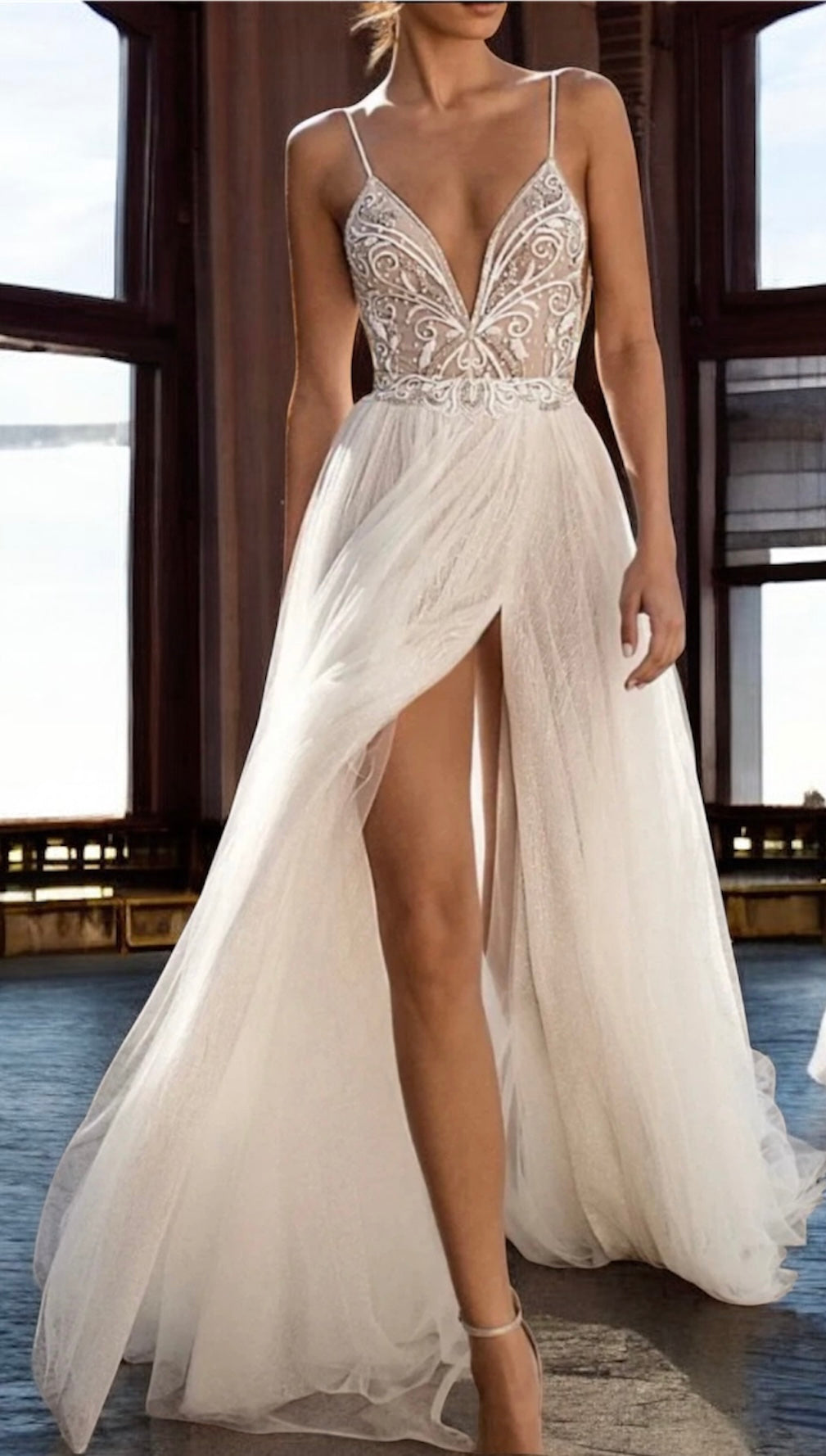Vestido de novia moderno y sensual con escote profundo en V y finos tirantes, ideal para novias que buscan un estilo elegante y sofisticado. El corset transparente está delicadamente trabajado con bordados de pedrería y encaje en patrones florales y arabescos, realzando la silueta con un toque glamuroso. La cintura se define con un cinturón bordado que estiliza la figura.