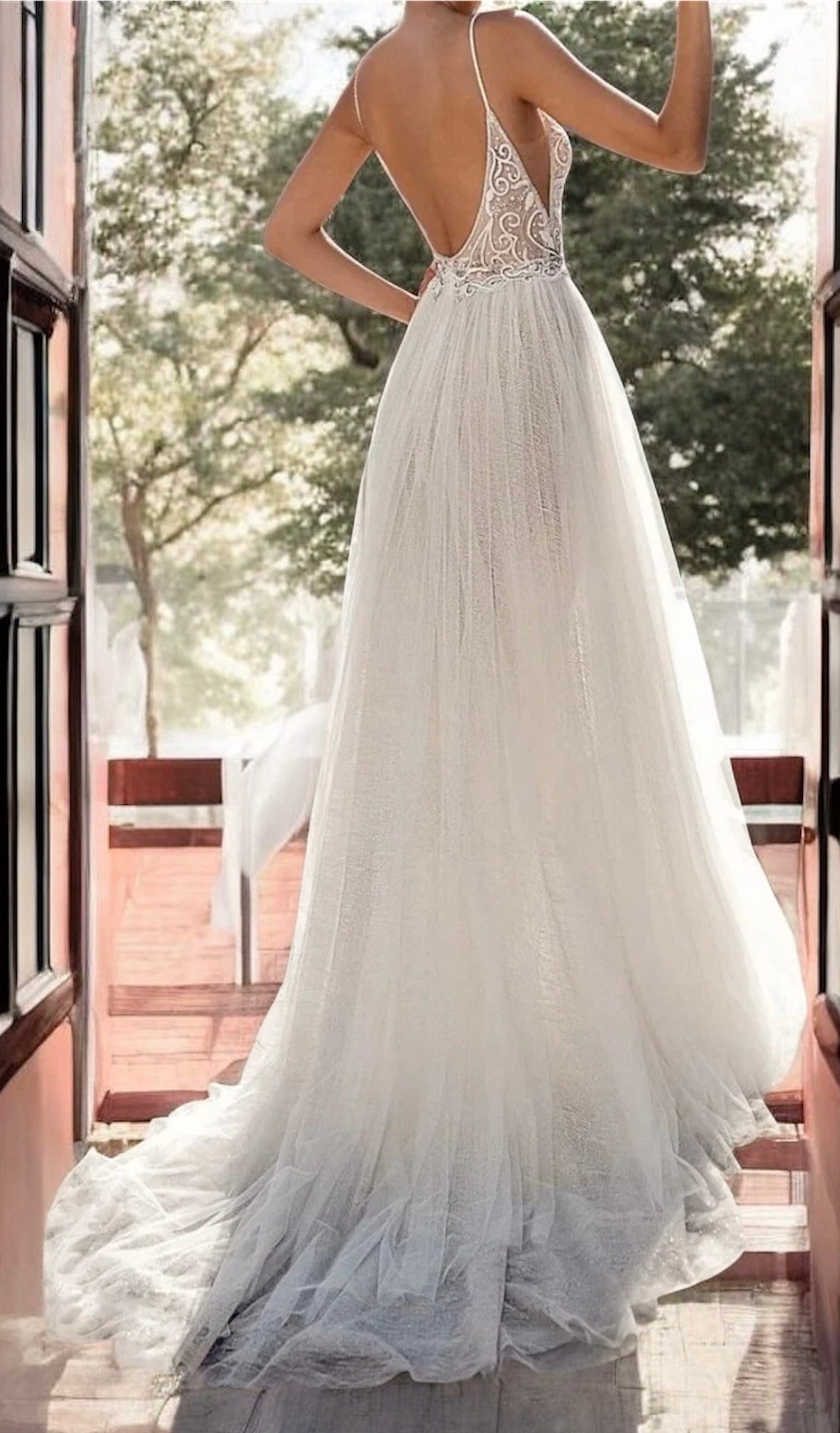 La falda, confeccionada en tul vaporoso y ligero, aporta movimiento y frescura, destacando una abertura lateral que brinda un aire romántico y atrevido a la vez. Perfecto para bodas en primavera o verano, este diseño combina sensualidad, delicadeza y modernidad.